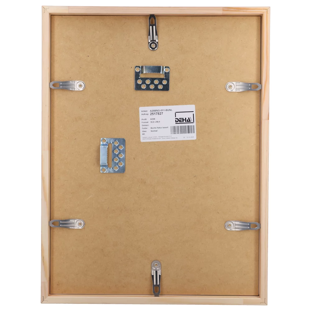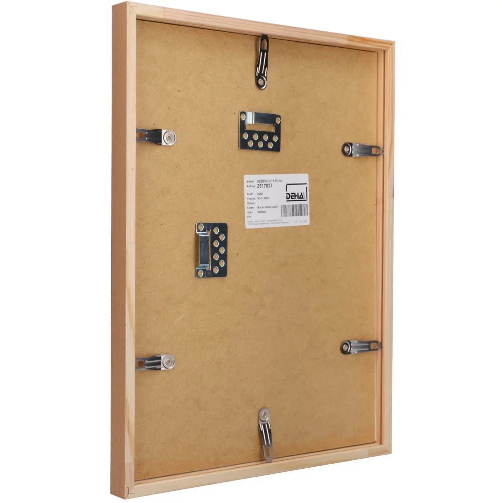 Opter pour un cadre de la marque DEHA, c’est opter pour un cadre de fabrication allemande, robuste et de qualité supérieure. Nos cadres sont fabriqués exclusivement avec du bois massif, entre autres du hêtre, du pin et de l’érable, provenant de forêts d’Europe gérées et exploitées conformément aux normes européennes. L’ensemble des cadres en bois de DEHA sont munis de tournettes solides, de haute qualité, ce qui en fait un véritable cadre « clic clac », autrement dit un cadre à ouverture facile pour changement fréquent d’image.